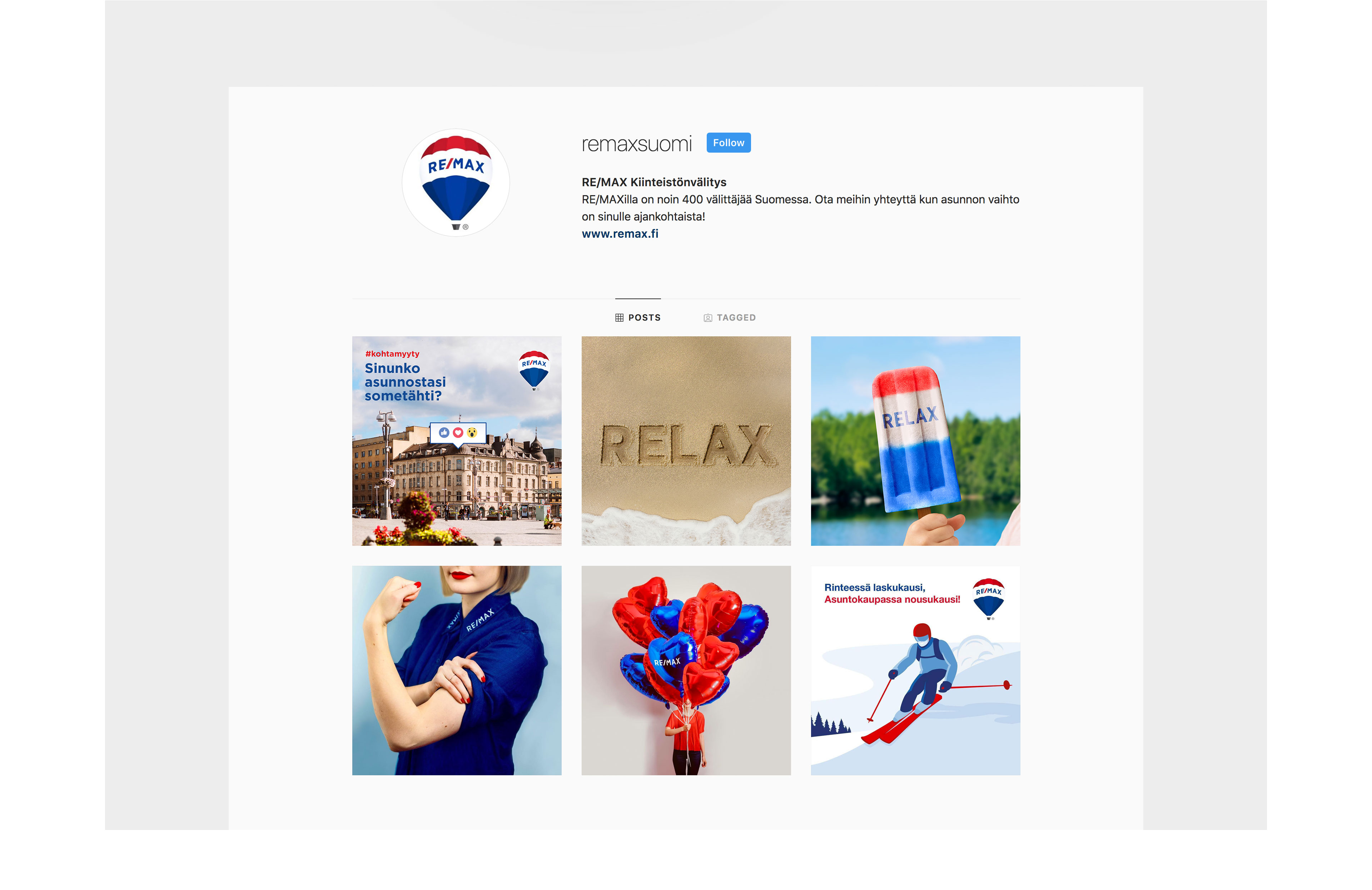 RE/MAX on maailman suurin kiinteistönvälitysketju, joka tehokkaan markkinointinsa ansiosta tarjoaa myyntikohteilleen markkinoiden laajimman näkyvyyden. Olemme suunnitelleet ja toteuttaneet RE/MAXille useita mainoskampanjoita, jotka sisältävät niin kampanjasivuja, display-mainontaa, Helsingin Sanomien etusivuilmoituksia, ulkomainontaa kuin lukemattoman määrän muuta markkinointimateriaalia.